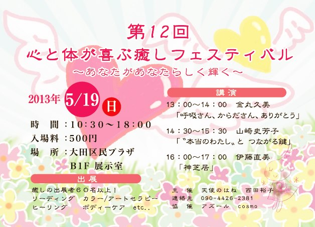 | 2013年5月19日(日) 10:30〜18:00 | 主催:天使の羽 |