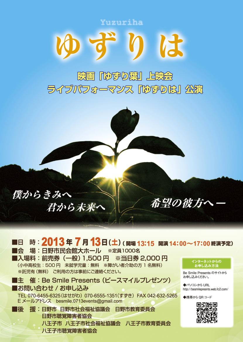 本イベント案内ページを提供しています桝田です。応援での告知となります。ろうあ者(耳が聞こえない)は映画が楽しめないってのを私は、映画「ゆずり葉」の紹介動画:http://ann.369ch.jp/2013/07/713_1.html を観て知りました。 理由はとても簡単で、映画は健常者(耳は聞こえる)対象で作られているので音だけになっているところが多いということです。 ろうあ者であるがためのいろいろな問題が全て明らかにした映画だと感じます。 申込みをされました方は、桝田経由でご連絡のメールなりお電話を差し上げます。 桝田も当日スタッフでのお手伝いをしています。当日、会場にてお会いしましょう。 http://yuzuriha.boobie.jp/ 申込みページもあります。 もし、最下位行の申込みから申し込まれました方は、当日桝田預かりのチケットをお渡しもできます。 −−以下、主催者からの情報です−− メインテーマ・・・「ゆずりは」 サブテーマ・・・僕からきみへ 君から未来へ 希望の彼方へ 日時:2013年7月13日(土) 午後2時〜午後5時 場所:日野市民会館・煉瓦ホール 東京都日野市神明1-12-1 料金:一般 前売 1500円 (当日 2000円) 小中高 500円 未就学児 障がい者介助者1名まで無料 後援:日野市・八王子市社会福祉協議会 他 イベント概要: 第1部14:00〜15:55 映画「ゆずり葉」上映 全日本ろうあ連盟創立60周年記念映画 文部科学省選定 厚生労働省推薦 第2部16:15〜17:00 ライブパフォーマンスステージ 宝木美穂 朗読 歌 構成 WEB:http://www.takaragi.com/ 立教大学在学中に芝居と出逢い、加藤健一事務所俳優教室を経て、演劇集団『酒井組』を立ち上げる。 NPO現代座にて市民演劇講座などを開催。2011年、マリンバ:今井万里子、テルミン:大西ようこ と「otoyomi:http://otoyomi.web.fc2.com/」を結成。 現在、歌と朗読を軸にユニークなライブ企画・プロデュースも手がける。 老人施設等での昭和歌謡コンサート、単独朗読会の他、文筆家として冒険童話『なめくじ乾太』ほか。 ボランティア団体『いのち☆つながる広場 日野』前代表。 二條容子 歌 ピアノ 音楽 WEB:http://urara-yoko315.com/ 福井県鯖江市出身。幼少の頃からクラシック音楽を学ぶ。県音楽コンクールにて入賞後、音楽大学への道を目指す。 武蔵野音楽大学声楽科を卒業後、企画、楽曲製作等を手がけ、お寺ライブや小学校コーラス指導、病院コンサート、ビジネス交流会での演奏等、様々なシーンで活動中。 また2011年より東京から山梨に拠点を移し、石和温泉地による旅館営業にも携わり、中国雑技団との東日本大震災チャリティー伊勢崎公演に共演。 今井万里子 打楽器演奏 WEB:http://marhythmimai.web.fc2.com/ 武蔵野音楽大学打楽器科を卒業後、結成した打楽器・マリンバアンサンブルで国際芸術連盟主催の新人オーディションにおいて最優秀新人賞を受賞。 現在は「Clappers」「otoyomi:http://otoyomi.web.fc2.com/」「AusMusik」に所属、「B-project」を主宰し、フリーの演奏家として活動中。 映画や舞台等劇中音楽に参加。また、打楽器の指導にも力を入れている。 打楽器を日比一宏、今村三明、久保昌一各氏に師事。 以下の第3部は、緊急企画決定(自由参加) 第3部)17:30〜18:15 武市敬広氏(通称にぽちゃん)の最後の講演ビデオ上映 2012年10月 日野市平山にて収録 皆様のご参加を心からお待ちしております。 +++++++++++++++++++++++++++++++++++++++++ ごあいさつ 「ゆずりは」を応援して下さっている皆様 いつもありがとうございます!! 「ゆずりは」実行委員長のユッコこと清水由貴子です。 →続きは、右記へ https://www.facebook.com/events/192646650883005/ | |