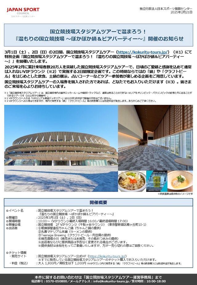 『3月1日(土)、2日(日)に『温もりの国立競技場 〜ぽかぽか鍋&ビアパーティー〜』を開催!3月1日(土)、2日(日)の2日間、国立競技場スタジアムツアーにて特別企画「国立競技場スタジアムツアーで温まろう! 『温もりの国立競技場 〜ぽかぽか鍋&ビアパーティー〜』」を開催いたします 2025年2月に累計来場者数20万人を突破した国立競技場スタジアムツアーで、日頃のご愛顧と感謝を込めて通常は入れないVIPラウンジ(※1)で実施する2日間限定企画です。この時期ならではの「鍋」や「クラフトビール」をはじめとした飲食、土鍋の展示、占いコーナーなどツアー参加者が楽しめる企画をご用意しています 国立競技場スタジアムツアーの入場券を購入された方であれば、どなたでもお入りいただけます(※2)。皆さまのご来場を心よりお待ちしています とのことです。以下もご覧ください。 → https://kokuritu-tours.jp/assets/20250221_nabe.pdf なお、両日ともにハートグラム診断や各種占いコーナーもございます。 5分までは無料ですが、以後10分1000円となっております。 開催日時:2025年3月1日(土)、2日(日)10時〜17時 VIPラウンジ最終入場時間 16:00/最終退場時間 17:00 開催会場:国立競技場 2F VIPラウンジ(千駄ヶ谷ラウンジ) 東京都新宿区霞ヶ丘町10-1 出店者:鍋、ラーメン、湯豆腐、餃子、クラフトビールなど+ハートグラム占い 入場:チケットの購入( https://kokuritu-tours.jpnsport.go.jp/ )が必要です。 | |