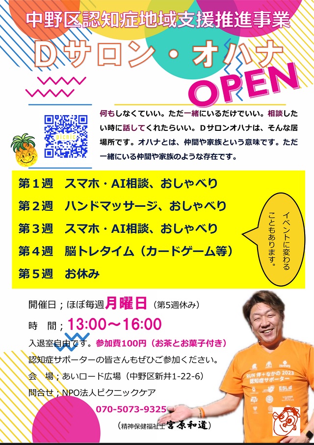 中野区認知症地域支援推進事業Dサロン・オハナ OPEN 何もしなくていい。ただ一緒にいるだけでいい。相談したい時に話してくれたらいい。Dサロンオハナは、そんな居場所です。 オハナとは、仲間や家族という意味です。ただ一緒にいる仲間や家族のような存在です。 第1週 スマホ・AI相談、おしゃべり 第2週 ハンドマッサージ、おしゃべり 第3週 スマホ・AI相談、おしゃべり 第4週 脳トレタイム(カードゲーム等) 第5週 お休み 開催日:ほぼ毎週月曜日(第5週休み) 時間:13:00〜16:00 入退室自由です。参加費100円(お茶とお菓子付き) 認知症サポーターの皆さんもぜひご参加ください。 会場:あいロード広場(中野区新井1-22-6) 問合せ:NPO法人ピクニックケア (精神保健福祉士 宮原和道) | |