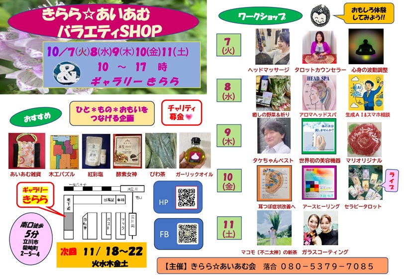 きらら☆あいあむ バラエティSHOPが、10月7日(火)〜11日(土)の5日間、10〜17時開催です。場所は、立川駅から歩いて5分程度にある「ギャラリーきらら」。 1か月に5日間だけのイベントとなり、私は、8日のみの出店です。 ★紹介動画:https://youtu.be/vmTk8iTd0f4 ★メインのおすすめ ・あいあむ雑貨 ・木工パズル ・紅彩塩 ・酵素女神 ・びわ茶 ・ガーリックオイル ★会場 立川駅南口徒歩5分 立川市柴崎町2-5-4 ★ワークショップ(おもしろ体験してみよう!!) 7日(火) ヘッドマッサージ タロットカウンセラー 心身の波動調整 8日(水) 癒しの野菜&祈り アロマヘッドスパ 生成AI&スマホ相談 9日(木) タケちゃんベスト 世界初の美容機器 マリオリジナル 10日(金) 耳つぼ症状改善へ アースヒーリング セラピータロット ライブあり 11日(土) マコモ【不二大神】の新茶 ガラスコーティング 【主催】きらら☆あいあむ会 落合 080-5379-7085 次回:11月18日(火)〜22(土) | |
