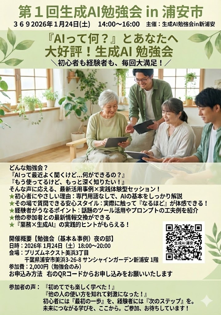 浦安でも開催が決まりました。千葉県ですが、都内の方でも参加できる距離にあると思うので、こちらでもご案内させていただきます。 「AIって何?」とあなたへ 大好評!生成AI 勉強会 \初心者も経験者も、毎回大満足!/ どんな勉強会? 「AIって最近よく聞くけど…何ができるの?」 「もう使ってるけど、もっと深く知りたい!」 そんな声に応える、最新活用事例×実践体験型セッション! ★初心者にやさしい理由 専門用語なしで、AIの基本をしっかり解説 ★その場で質問できる安心スタイル 実際に触って「なるほど」が体感できる! ★経験者がうなるポイント 話題のツール活用やプロンプトの工夫例を紹介 ★他の参加者との最新情報交換ができる ★「業務×生成AI」の実践的ヒントがもらえる! 開催概要 【勉強会(基本&事例)】 日時:2026年1月24日(土)14時〜16時勉強会、その後19時まで交流会 会場:プリズムネクスト美浜3丁目 千葉県浦安市美浜3ー26ー8 サンシャインガーデン新浦安 1階 参加費:勉強会のみ2,000円 交流会1,000円 お申込み方法 以下、参加申し込みフォームにご記入ください。 参加者の声: 「初めてでも楽しく学べた!」 「具体例が豊富で、明日からすぐ使えそう!」 「他の人の使い方を知れて刺激になった!」 初心者には「最初の一歩」を、 経験者には「次のステップ」を。 未来につながる学びを、ここから。 ご参加、お待ちしています! | |