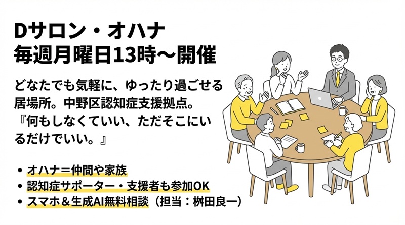 Dサロン・オハナは、中野区認知症地域支援推進事業の認知症支援拠点一つです。どなたでも気軽に立ち寄り、お話しや相談をしたりゆったり過ごしていただけます。 何もしなくていい。ただそこにいるだけでいい。必要な時に相談したらいい」をコンセプトにした居場所です。 オハナとは、仲間や家族という意味です。ただ一緒にいる仲間や家族のような存在です。 認知症サポーターの方や認知症を支援されている方もぜひご参加ください。 認知症サポーターの桝田良一は、スマホ&生成AI相談を受け付けています。無料です。 桝田は、5月は、4日、18日日居てます。第1と第3月曜日だけいてるんです。 開催概要 日時:毎週月曜日 13:00〜16:00 ※第5週目はお休み 会場:あいロード広場(新井1-22-6) 参加費:あり(100円) 名称:Dサロン・オハナ 申込締切日:随時 当日参加OK 問い合わせ先 NPO法人ピクニックケア(宮原)【電話番号】070-5073-9325 | |