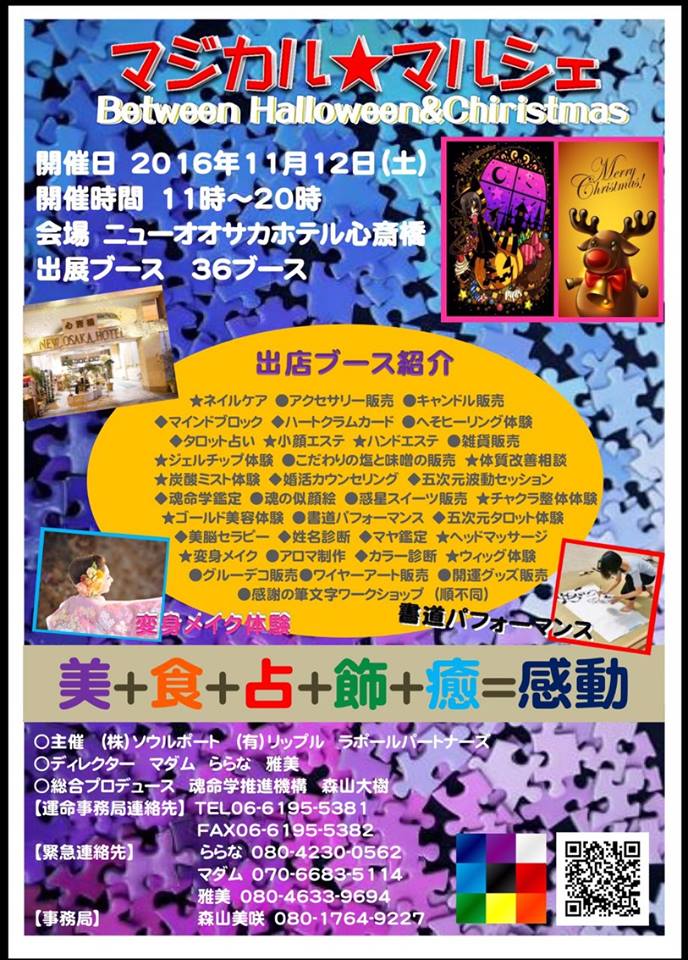 第1回マジカルマルシェに出店します。ハートグラムカードでの恋愛&ビジネス診断です。 和魂カードでも深く診断をさせていただきます。 ※カードの詳細は最下位に説明あります。 また、占い師としてのデビューもできるがハートグラムカードです。 現在、大阪、名古屋、東京の仲人さん30人にご利用をいただいております。 会場は心斎橋にありますアメリ村の一角、心斎橋ニューオオサカホテルでの開催です。 まずは、ご体験ください。 奮ってのご参加をお待ちしております。 内容:恋愛・相性診断、起業・転職診断、収入アップアドバイス 日時:2016年11月12日(土) 屋外は11時〜20時、屋内は14時〜20時 私は屋内になるかも・・・ 参加費:無料 鑑定料:10分体験鑑定500円〜 会場:ニューオオサカホテル心斎橋 住所:大阪府大阪市中央区西心斎橋1−10−36 地下鉄御堂筋線心斎橋駅8番出口→徒歩約2分 会そのものの主催者:株式会社ソウルポート リップル ラボールパトナズ 【ハートグラムカード】 結婚相談を15年以上されてきた藤田サトシ先生が考案。2016年7月に発売が開始され、2ヶ月間で利用者が150人を超えました。最初は、説明書を見ながら、カード鑑定を進めますが、数をこなすと性格パターンが分かってきますし、5つの個性から、その方の抱える問題を当ててしまいます。結果、信頼関係を気付き、営業クロージングに持っていくことができます。一部、カウンセリングの手法が入っており、知らないうちにカウンセラーになることになります。 【和魂(一霊四魂)カード】 古神道からひも解かれた、性格を4つに分ける考え方となっており、荒魂(あらみたま)、和魂(にぎみたま)、幸魂(さちみたま)、奇魂(くしみたま)のどれが強いか弱いかで診断をし、一霊(直日)に戻り、相手と付き合うことにより、心の葛藤が無くなると言うものです。 ハートグラム、和魂の根底には、相手を変える前に自らを変える(相手を徹底的に知る)と言う日本人の持つ和魂(和合)の考えがあります。自らを律すること。元来の日本人の自らを正すことをハートグラムカードを使うことで、誰でもが理解が進みます。一石三鳥以上の効果が期待できるのが、ハートグラムであると考えております。 | |