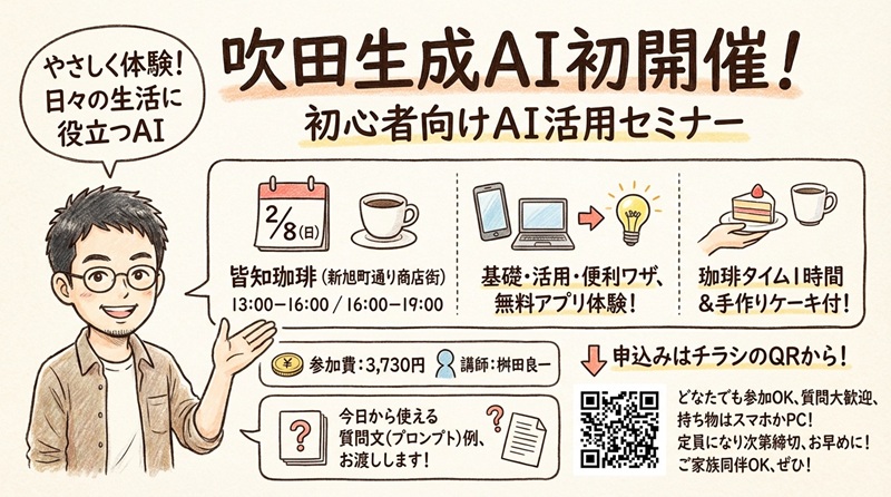 13時〜の部:https://369evt.biz/27/2026/0208_246.htmlAIってなに? 何に使えるの? 吹田で初開催となる生成AI勉強会です。 講師は、東京・銀座で1年で500人の生成AIの学びに関わった桝田先生です。 桝田さんは42年のIT業界で活躍をされています。 即実践で使える生成AIのお話をしていただきます。 対象者 ・どなたでもご参加いただけます ・AIに興味のある初心者の方 内容 ・AIってなに?(基礎知識) ・日常生活でのAI活用事例 ・スマホやパソコンで使える便利なAI体験 ・アプリを実際使ってみよう! 持ち物 ・スマホ・パソコン いずれか ・無料アプリを使用します。 ・事前の準備は必要ありません。 講師 桝田良一 1964年生 東京都中野区在住 元日立プログラマー 1991年「あん共育有限会社」創設 石川県のIT相談員となる 2006年 NPO法人「こらぼる」 「国際きぐるみセラピー協会」設立 2007年、2008年マイクロソフトMVP受賞 現在は認知症カフェ、生成AI勉強会を主宰し、人材育成とAI活用に注力 皆知珈琲 吹田市内本町2-1-16 店主 南善勝 ウェルカム珈琲 珈琲タイム 1時間 手作りケーキ付 お申込み 以下のフォームからお申し込みをください。 | |