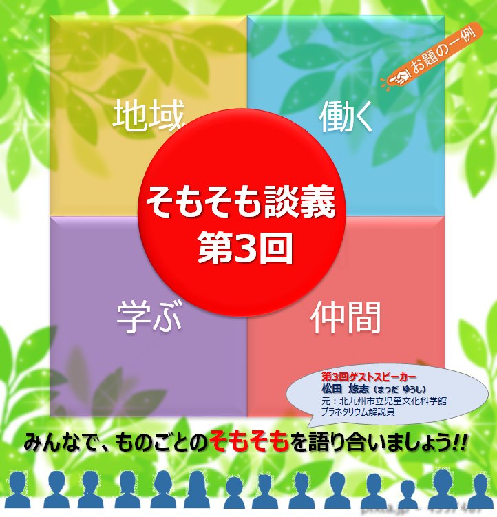 ◆みんな〜〜〜!若松に集合!!!北九州市若松区に開設された北九州市環境コミュニティーセンターにおいて、社会起業大学・九州校の出前講座として、「そもそも談義・第3回」を開催いたします。 ◆そもそも談義とは、根本を指す語元々、元から、元来、語源、始まりなどのように、物事の始まりや、 問題の起きた理由などに立ち戻って、正解の無い問いに対して、ゲストスピーカーと参加者が共にワイワイガヤガヤと語り合う会です。ではなぜ、そもそも談義なのか?それは、経済的、物質的、精神的に豊かになりすぎた現代において、あらゆる事柄が人々の想像を超えたスピードで変化と進化を続けています。本来そのことが現在の意味や使われ方と違う形にまで変化していると、考えることが多々有ります。場合によっては、あまりにも違う形で使われていることも多くあります。例えば、「クリスマス」とは、本来イエス・キリストの誕生を祝うものであったのが、今では親しい人とケーキを食べる年末の一大イベントのようになっています。「ハロウィーン」は、古代ケルト人が起源と考えられている祭りで、もともとは秋の収穫を祝い、悪霊などを追い出す宗教的な意味合いのある行事です。しかし、今の日本では年に一度の仮装大会もしくはパーティーのようになっています。そこで、そもそも談義では、事柄物事の根本や始まり、起源などを今一度見直すことで、その事柄の成り立ちや所以を紐解き、考えることで、その事柄の中に織り込まれた意味や想いについて、参加者の皆さんと一緒に談義を行います。それにより、従来の概念から新たな概念を育み、今までとすこし違った関わり方になっていただきたいと考えています。決して、歴史を学び、過去に立ち返るためだけのものではありません。「そもそも」を考えることで、これからの時代のあり方や関わり方を創り上げる会であればと考えています。ここ北九州市環境コミュニティーセンターでこのような講座が開けることは、まさに必然ではないかと考えています。なぜならば、この場所は、環境についてのコミュニティーのセンターである。環境とは、単に自然や公害、空間などの周囲のものだけではなく、時代や歴史、立場、人生、関係などなどあらゆることに関わるものだと考えるからです。しかしながら、この談義は、決して答えを出すためのものではありません。皆さんと一緒に考える場と一緒に学ぶ場の提供であると考えています。 どうぞ、そもそもという、面倒くさい、取りつく間もない、モヤモヤな談義に参加してみませんか?老若男女どなたでも参加可能です。 「そもそも談義」では、当日にその日のお題を提供させていただきます。今回の談義の議題も、シークレットです。どうぞ、お気軽に、そしてわくわくしながら、ご参加ください。皆様の参加をお待ちしています。 最後に、参加者は、是非なんでも良いから発言をお願いします。皆さんの発言で談義が進行し、談義が成立するからです。「恥ずかしさ」と「謙虚さ」は、どうぞ家に置いて来てください。そして、そもそも談義を楽しみましょう!! お待ちしています。 《そもそも談義の進め方》 本日のお題「○○○」の発表 → ゲストスピーカーによるお話 → ゲストスピーカーとモデレーターとのトークセッション → 参加者は、3枚のポストイットに自分の考えを書く → 会場のホワイトボードに掲載する → その中の気になるキーワードからトークセッション → 全員参加型でのトークセッション → 結論のない結論(解散) 《目的・成果》 ・日常生活の中で当たり前と思われていることを改めて考え、物事の始まりや由来など知ることで、新たな気づきを得る。 ・答えの無い問いに対して考えることで、ものの見方や価値観が変わり、新たなる知の創造が生まれる。 ・多様なメンバーで解らないことを一緒に考えることで生まれるコミュニティー形成 日時:5月15日(金)午後6時〜午後8時 場所:北九州市環境コミュニティーセンター 住所:〒808-0034 福岡県北九州市若松区本町2丁目9番4号 お問い合わせ:社会起業大学・九州校 093-513-0003 参加申込は: ●社会起業大学・九州校HPのセミナーページより そもそも談義 in 北九州市環境コミュニティーセンター コチラから → (https://kyushu.socialvalue.jp/workshop150515/) ●社会起業大学・九州校FACEBOOKページより そもそも談義 in 北九州市環境コミュニティーセンター 当日参加もOKです。 | |