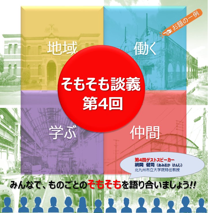 ◆みんな〜〜〜!若松に集合!!!北九州市若松区に開設された北九州市環境コミュニティーセンターにおいて、社会起業大学・九州校の出前講座として、「そもそも談義・第4回」を開催いたします。 ◆そもそも談義とは、根本を指す語元々、元から、元来、語源、始まりなどのように、物事の始まりや、 問題の起きた理由などに立ち戻って、正解の無い問いに対して、ゲストスピーカーと参加者が共にワイワイガヤガヤと語り合う会です。ではなぜ、そもそも談義なのか?それは、経済的、物質的、精神的に豊かになりすぎた現代において、あらゆる事柄が人々の想像を超えたスピードで変化と進化を続けています。本来そのことが現在の意味や使われ方と違う形にまで変化していると、考えることが多々有ります。場合によっては、あまりにも違う形で使われていることも多くあります。例えば、「クリスマス」とは、本来イエス・キリストの誕生を祝うものであったのが、今では親しい人とケーキを食べる年末の一大イベントのようになっています。「ハロウィーン」は、古代ケルト人が起源と考えられている祭りで、もともとは秋の収穫を祝い、悪霊などを追い出す宗教的な意味合いのある行事です。しかし、今の日本では年に一度の仮装大会もしくはパーティーのようになっています。そこで、そもそも談義では、事柄物事の根本や始まり、起源などを今一度見直すことで、その事柄の成り立ちや所以を紐解き、考えることで、その事柄の中に織り込まれた意味や想いについて、参加者の皆さんと一緒に談義を行います。それにより、従来の概念から新たな概念を育み、今までとすこし違った関わり方になっていただきたいと考えています。決して、歴史を学び、過去に立ち返るためだけのものではありません。「そもそも」を考えることで、これからの時代のあり方や関わり方を創り上げる会であればと考えています。ここ北九州市環境コミュニティーセンターでこのような講座が開けることは、まさに必然ではないかと考えています。なぜならば、この場所は、環境についてのコミュニティーのセンターである。環境とは、単に自然や公害、空間などの周囲のものだけではなく、時代や歴史、立場、人生、関係などなどあらゆることに関わるものだと考えるからです。しかしながら、この談義は、決して答えを出すためのものではありません。皆さんと一緒に考える場と一緒に学ぶ場の提供であると考えています。 どうぞ、そもそもという、面倒くさい、取りつく間もない、モヤモヤな談義に参加してみませんか?老若男女どなたでも参加可能です。 「そもそも談義」では、当日にその日のお題を提供させていただきます。今回の談義の議題も、シークレットです。どうぞ、お気軽に、そしてわくわくしながら、ご参加ください。皆様の参加をお待ちしています。 最後に、参加者は、是非なんでも良いから発言をお願いします。皆さんの発言で談義が進行し、談義が成立するからです。「恥ずかしさ」と「謙虚さ」は、どうぞ家に置いて来てください。そして、そもそも談義を楽しみましょう!! お待ちしています。 《そもそも談義の進め方》 本日のお題「○○○」の発表 → ゲストスピーカーによるお話 → ゲストスピーカーとモデレーターとのトークセッション → 参加者は、3枚のポストイットに自分の考えを書く → 会場のホワイトボードに掲載する → その中の気になるキーワードからトークセッション → 全員参加型でのトークセッション → 結論のない結論(解散) 《目的・成果》 ・日常生活の中で当たり前と思われていることを改めて考え、物事の始まりや由来など知ることで、新たな気づきを得る。 ・答えの無い問いに対して考えることで、ものの見方や価値観が変わり、新たなる知の創造が生まれる。 ・多様なメンバーで解らないことを一緒に考えることで生まれるコミュニティー形成 《ゲストスピーカー》 北九州市立大学大学院マネジメント研究科 特任教員 網岡 健司氏 網岡 健司 氏 略 歴 新日鉄興和不動産株式会社九州支店 副支店長 北九州市役所 参与 北九州市立大学大学院マネジメント研究科 特任教員 1983年新日本製鐵梶i現新日鐵住金梶j入社、八幡製鐵所配属。 1988年より同社の(テーマパーク)スペースワールド班に参加、以降一貫して東田地区の都市再開発事業など北九州の地域開発に携わる。同時に、北九州市特区専門官、参与を兼職、官民一体の立場から、まちづくりの一環として地域プロジェクトを企画・プロデュース、「情報の港」北九州e-PORTやエネルギー革命をもたらすスマートコミュニティ実証事業、産業遺産の世界遺産登録など数々の案件を手掛けている。2014年7月より現職。 《詳細》 日時:6月19日(金)午後6時〜午後8時 場所:北九州市環境コミュニティーセンター 住所:〒808-0034 福岡県北九州市若松区本町2丁目9番4号 お問い合わせ:社会起業大学・九州校 093-513-0003 参加申込は: ●社会起業大学・
